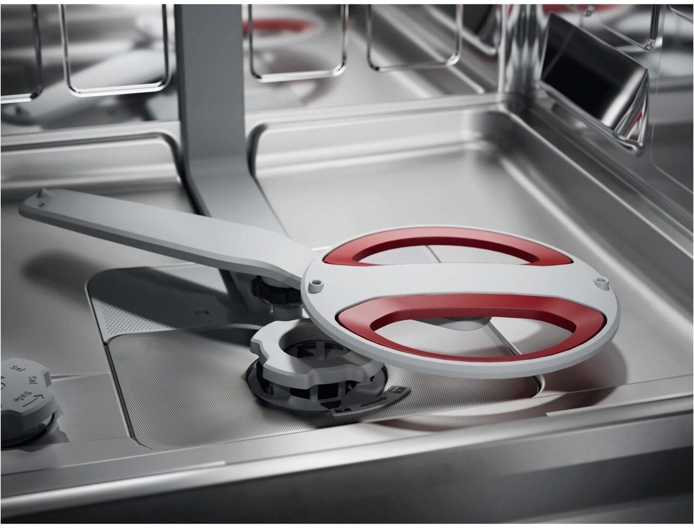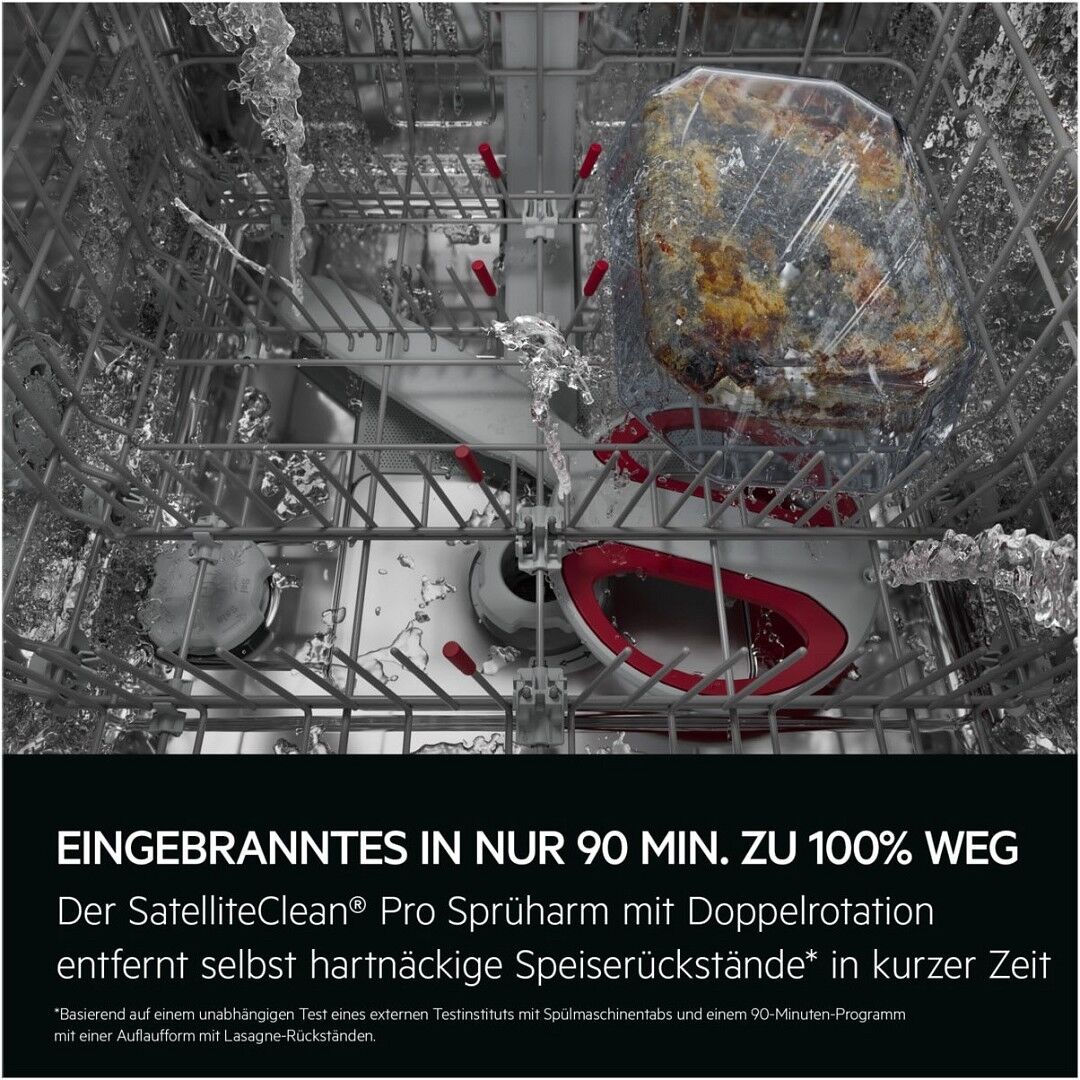 Der SatelliteClean® Pro Sprüharm mit Doppelrotation erreicht jeden Winkel des Geschirrspülers – für eine 100%ige Entfernung selbst hartnäckiger Speiserückstände wie Eingebranntem in nur 90 Minuten*. Und das ganz ohne zusätzlichen Wasserverbrauch.