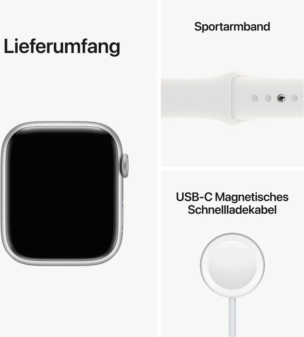 ⁶ Die Apple Watch Series 8 ist nach ISO Norm 22810:2010 wassergeschützt bis 50 Meter. Das bedeutet, sie ist für Aktivitäten in flachem Wasser wie Schwimmen in einem Pool oder im Meer geeignet. Die Apple Watch Series 8 sollte aber nicht beim Sporttauchen, Wasserski oder bei anderen Wasseraktivitäten mit hohen Geschwindigkeiten oder in tieferem Wasser verwendet werden. Wasserschutz ist kein dauerhafter Zustand und kann im Laufe der Zeit abnehmen. Weitere Infos findest du unter support.apple.com/de-de/HT205000.