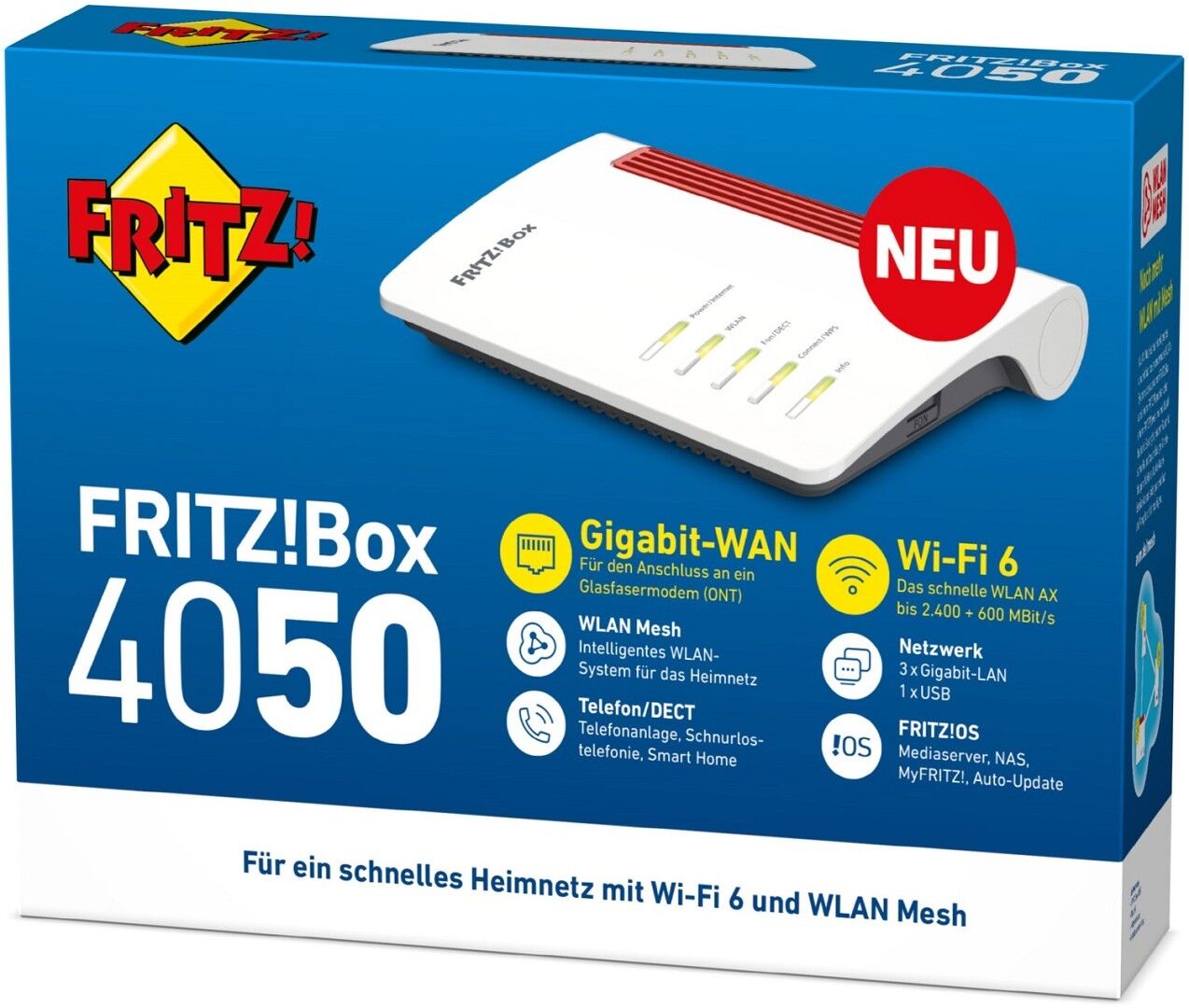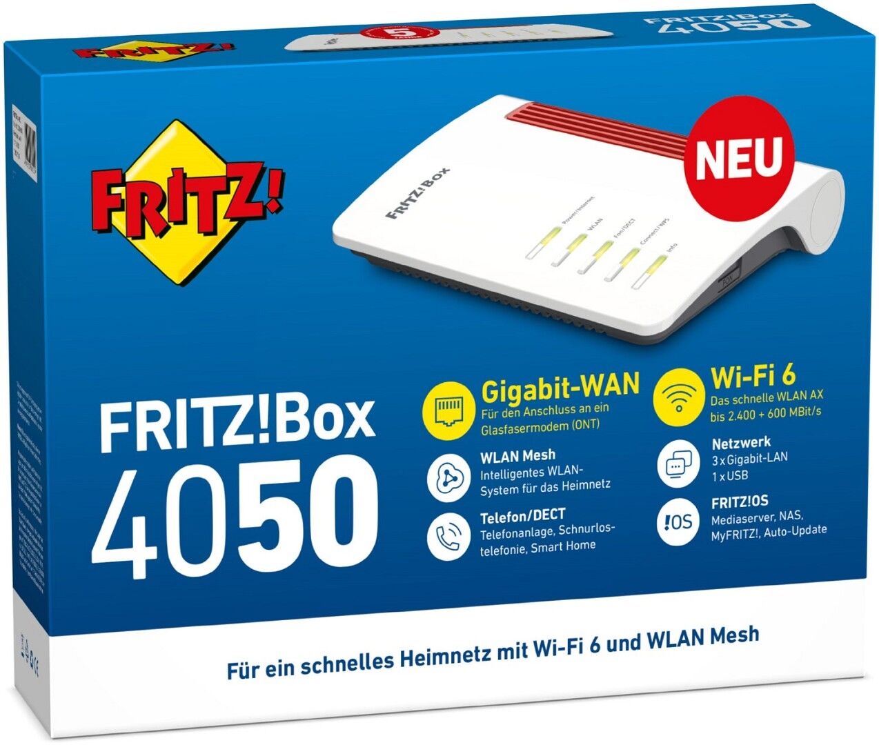 Über die integrierte DECT-Basis werden Smart-Home-Geräte wie der Heizkörperregler FRITZ!DECT 302, die schaltbaren Steckdosen FRITZ!DECT 200/210, der Taster FRITZ!DECT 440 und die LED-Lampe FRITZ!DECT 500 gesteuert. Über die VoIP-fähige TK-Anlage von FRITZ!Box 4050 werden ein analoges Telefonendgerät und bis zu sechs DECT-Telefonhandgeräte angebunden. Per WLAN werden auch Smartphones zum vollwertigen VoIP-Telefon. Mehrere integrierte Anrufbeantworter, lokale und Online-Telefonbücher sowie zahlreiche Komfortfunktionen runden das breite Angebot ab.
