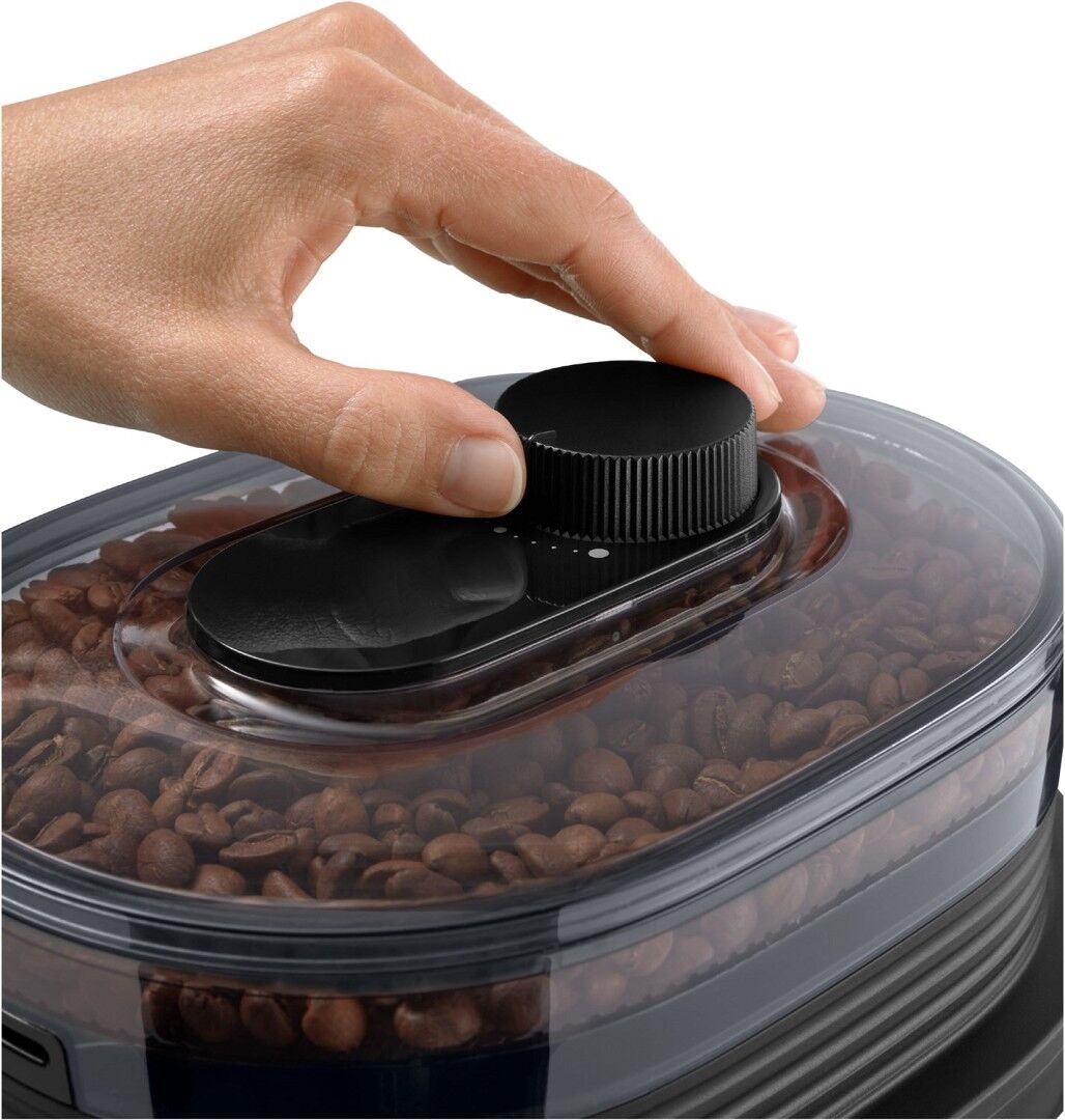 Das Mahlwerk bietet individuelle Einstellmöglichkeiten für jeden Kaffeeliebhaber. Entnehmbare Komponenten sowie das integrierte Entkalkungsprogramm erleichtern die Reinigung. Mit ihrem modernen Design in Mattschwarz ist die Filterkaffeemaschine ein Hingucker in jeder Küche!