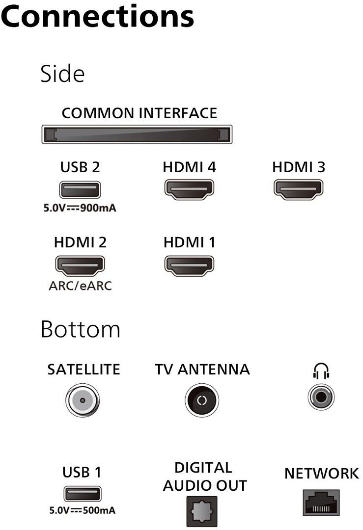 - DVB-T2/-C/-S2 Triple Tuner, 4x HDMI, HDMI 2.1, 2x USB, CI+, Digitaler Audio-Ausgang (optisch), Ethernet-LAN, WLAN 802.11ac, 2 x 2 Dualband & Bluetooth 5.2 integriert