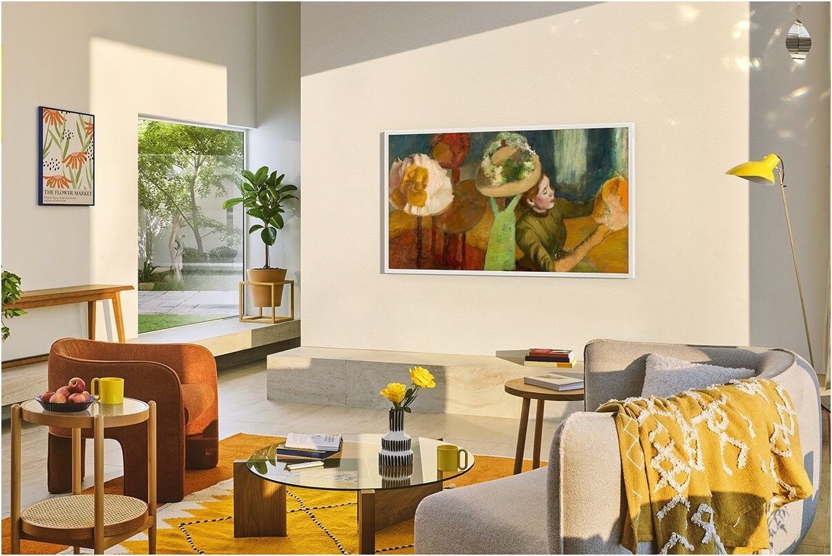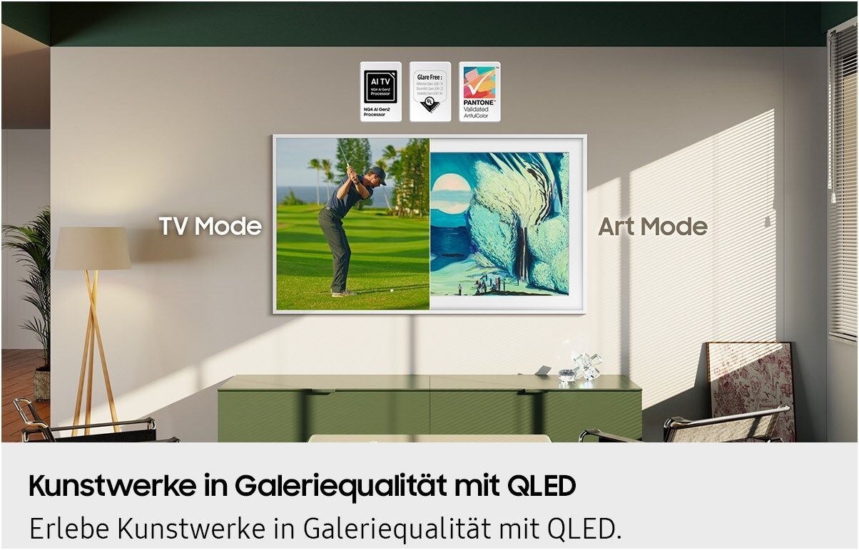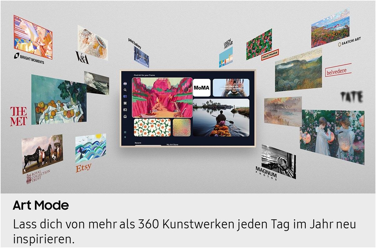 - Verwandle mithilfe des Art Modes deine Wohnung in eine virtuelle Kunstgalerie mit wechselnden Kunstwerken, wenn du gerade nicht Fernsehen guckst.