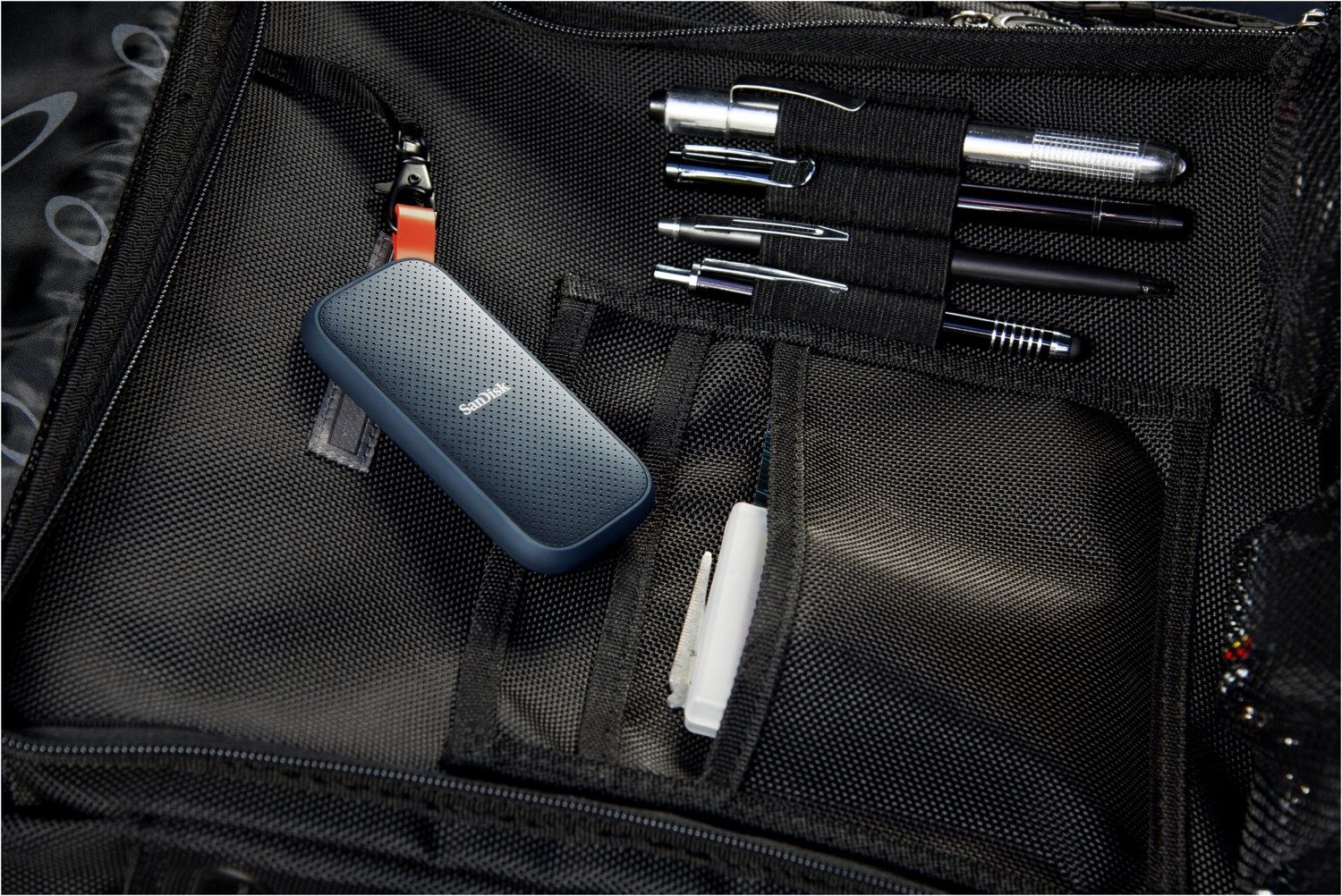 Mit dem stabilen Gummihaken können Sie die SSD sicher an Gürtelschlaufen oder einem Rucksack befestigen.
