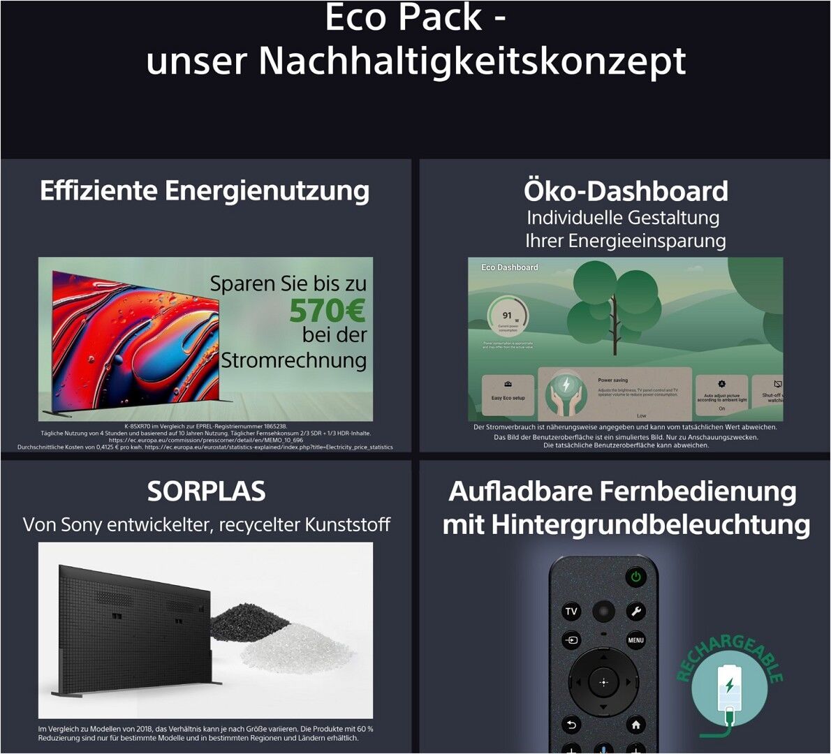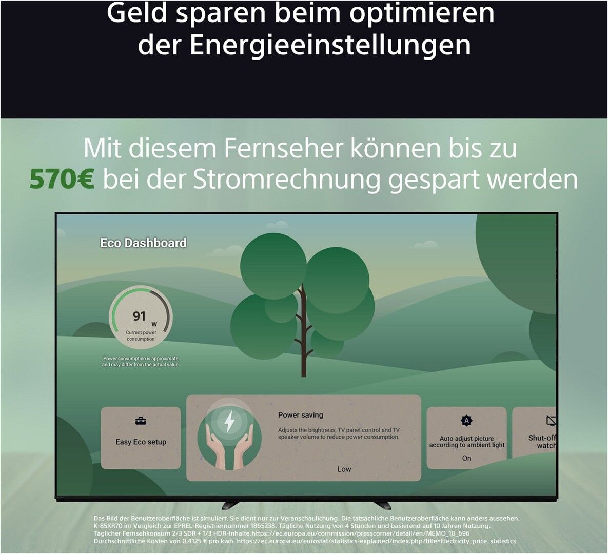 *9 K-85XR70 im Vergleich zur EPREL-Registriernummer 1865238. Tägliche Nutzung von 4 Stunden und basierend auf 10 Jahren Nutzung. Täglicher Fernsehkonsum 2/3 SDR + 1/3 HDR-Inhalte.https://ec.europa.eu/commission/presscorner/detail/en/MEMO_10_696 Durchschnittliche Kosten von 0,4125 € pro kwh. https://ec.europa.eu/eurostat/statistics-explained/index.php?title=Electricity_price_statistics