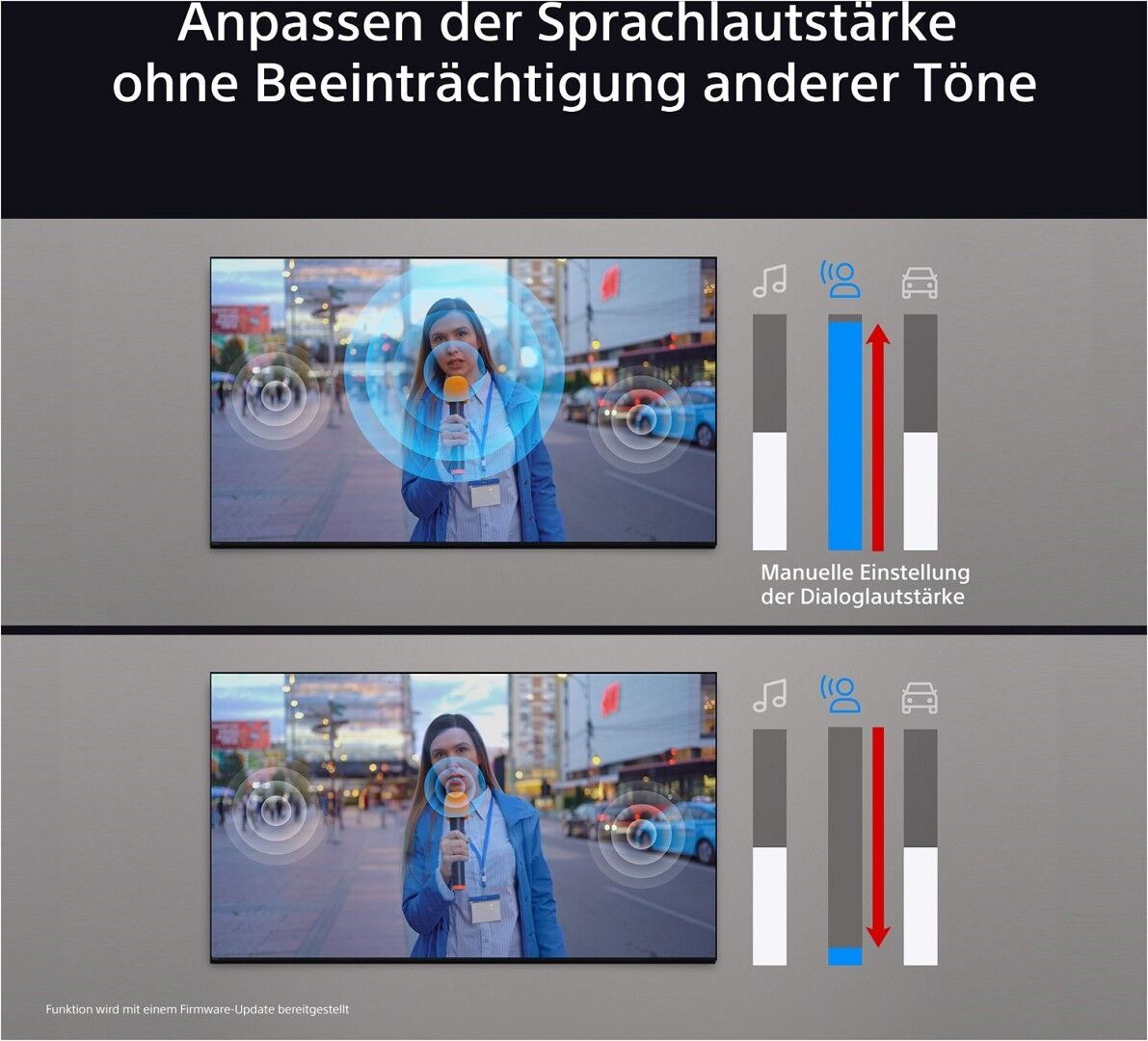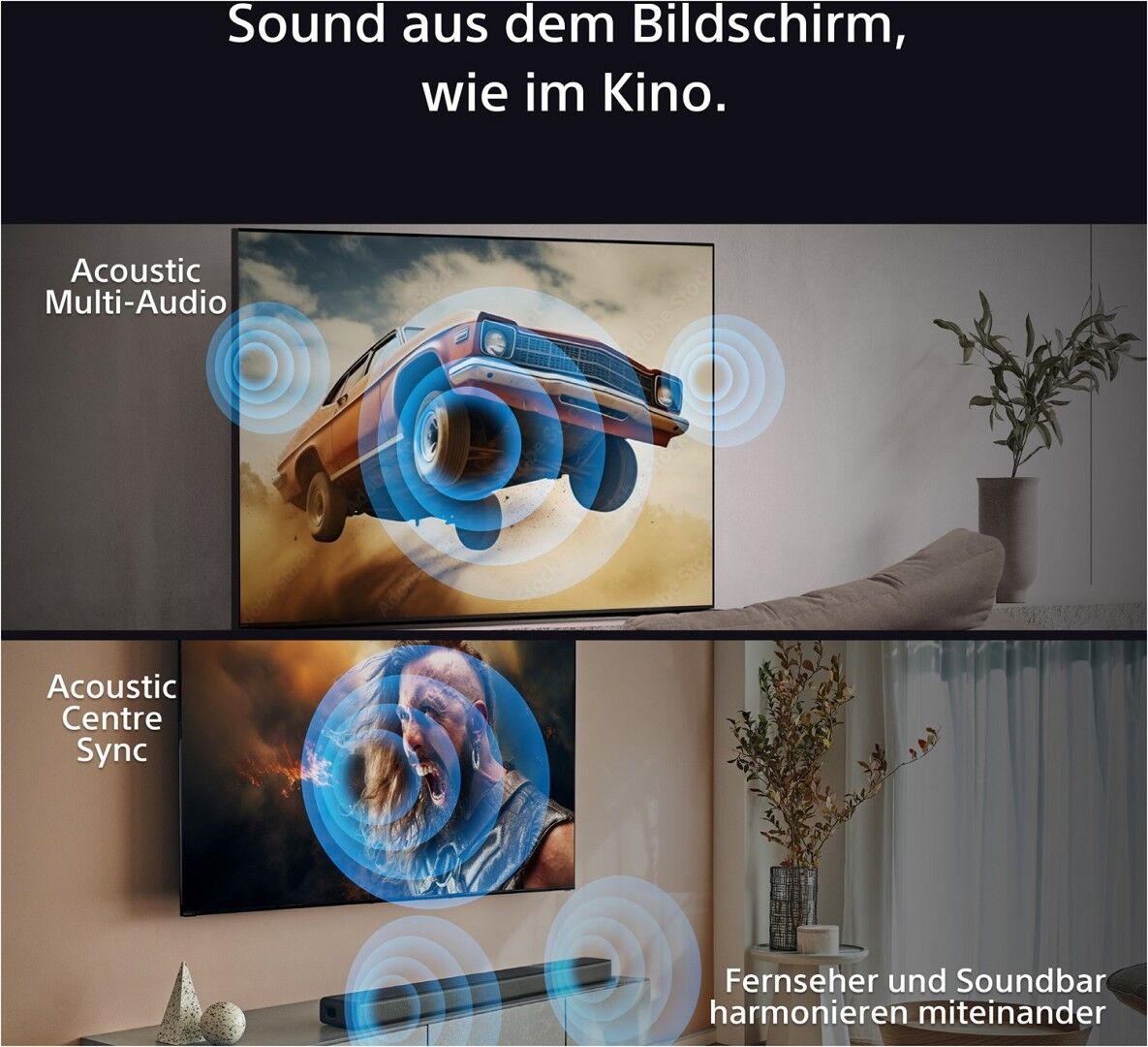 Dank der Acoustic Multi-Audio-Technologie, die den Bildschirm in einen Lautsprecher verwandelt, genau wie bei einer Kinoleinwand, kann jeder Teil des Geschehens genau gehört werden!