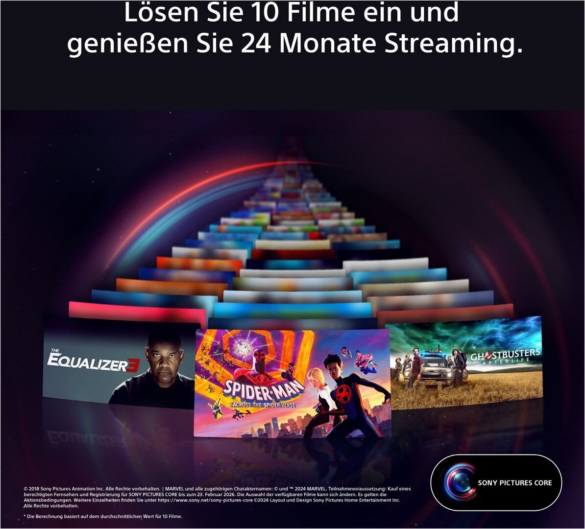 - In der SONY PICTURES CORE App 10 Filme einlösen, mit 24 Monaten Streaming. Von IMAX® Enhanced bis Dolby Atmos® - es gibt keinen besseren Weg zu sehen, wie unglaublich Filme auf dem BRAVIA 7 sind!