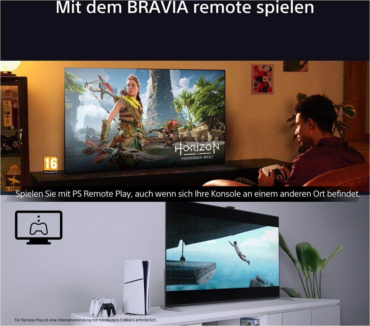 *13 Zum Streamen Ihrer Spiele auf andere Geräte ist eine PS4™- oder PS5®-Konsole erforderlich. PS Remote Play kann über eine mobile Datenverbindung oder Wi-Fi verwendet werden. Eine Breitband-Internetverbindung mit mindestens 5 Mbit/s ist erforderlich. Für ein besseres PS Remote Play-Erlebnis wird eine Hochgeschwindigkeitsverbindung mit mindestens 15 Mbit/s empfohlen, entweder über Wi-Fi oder eine mobile Datenverbindung. Titel, die ein VR-Headset (PlayStation®VR oder PlayStation®VR2) oder zusätzliche Peripheriegeräte (außer einem DUALSHOCK®4, DualSense™ oder DualSense Edge™ Wireless-Controller) erfordern, sind nicht mit PS Remote Play kompatibel.