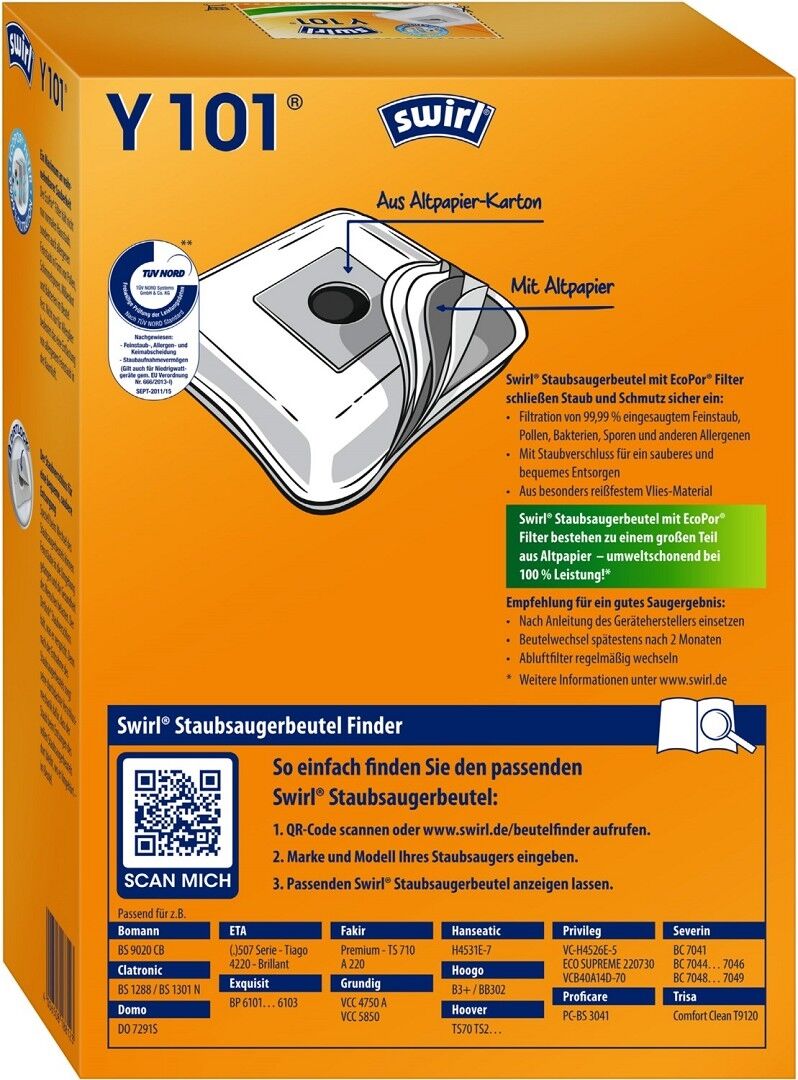 Y 101 EcoPor® Staubsaugerbeutel von Swirl® Swirl® Staubsaugerbeutel schließen Staub und Schmutz sicher ein. Bestehend aus besonders reißfestem Vlies-Material, filtern die Beutel 99,99% des eingesaugten Hausstaubs und allergenen Feinstaubs.